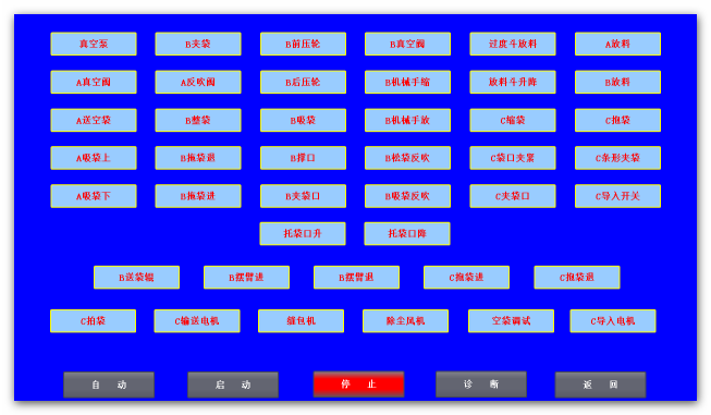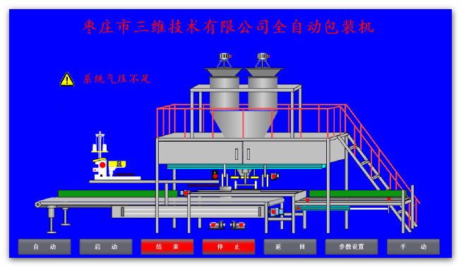 運(yùn)行畫面顯示設(shè)備示意圖、操作按鈕、運(yùn)行指示燈及相關(guān)報(bào)警信息等。