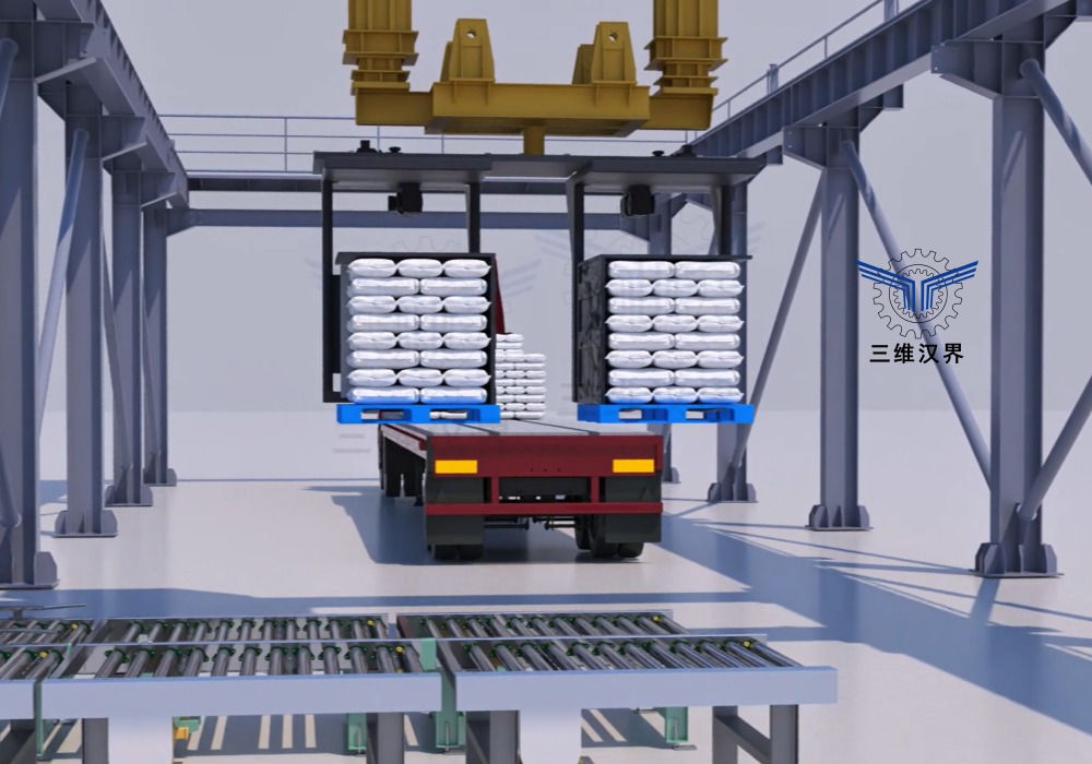 如果是推板式,推板會(huì)向前運(yùn)動(dòng),將最前面的一層貨物從托盤上“推”到等待的裝車臂或傳送帶上,同時(shí)后面的貨物被擋板擋住。托盤則被保留在翻轉(zhuǎn)機(jī)構(gòu)上。